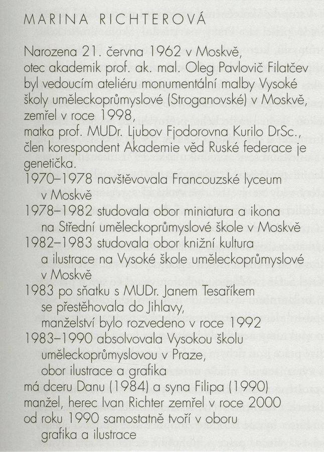 ak.mal. Marina RichterováOd roku 1990 samostatně tvoří v oboru volné grafiky a v oblasti knižní ilustrace, kde realizovala řadu vydaných titulů. Její práce je zastoupena v soukromých i veřejných sbírkách u nás i v zahraničí. Svoji práci představuje především na autorských, ale i kolektivních výstavách v ČR. Samostatně vystavuje v řadě zemí Evropy, Afriky, amerického kontinentu a v Asii. Ke svému dílu i celé této oblasti výtvarné tvorby publikuje řadu textů. Je nositelkou našich a světových ocenění.