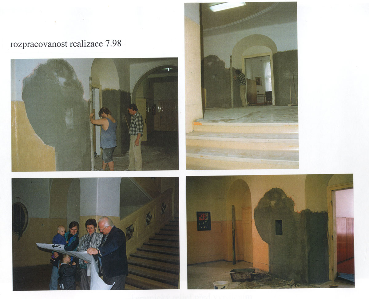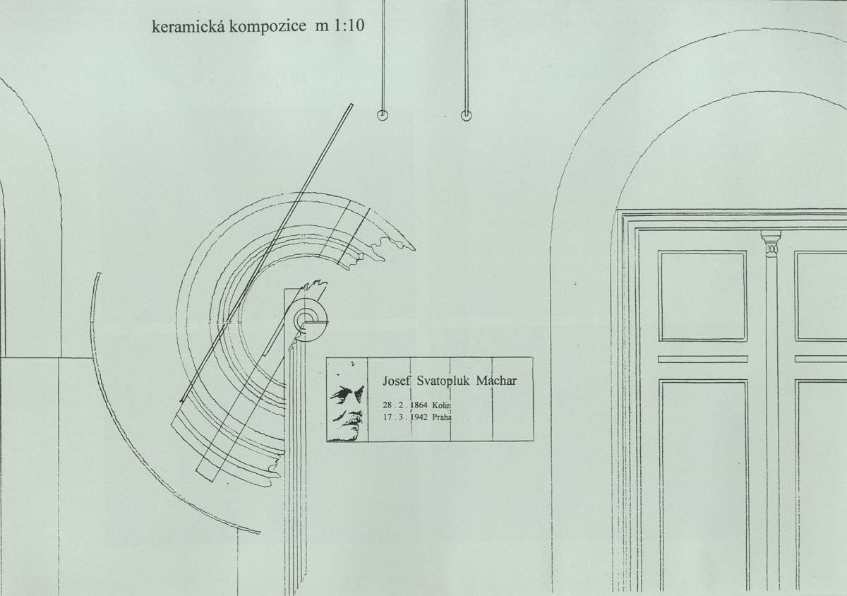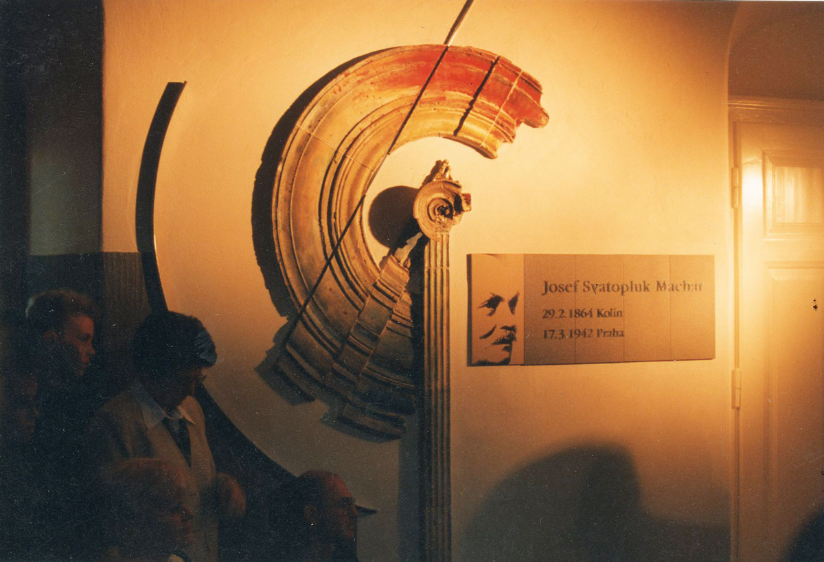 Josef Svatopluk Machar, výrazná postava předválečné republiky, byl v užším vztahu k městu Brandýs nad Labem. Tehdejší ředitel tamějšího gymnazia, profesor PhDr. Tobrman, vyjádřil svůj vztah k Macharovi snahou o pietní, při tom nekomformní uložení jeho ostatků. Urna s popelem básníka v budově gymnazia je nedostupná a neidentifikovatelná. Nelze ji nalézt, nelze ji spatřit, neví se o její existenci. Josefa Svatopluka Machara připomíná jen keramický kruh antického slunce a nerezový paprsek stříbrného světla - antické Řecko bylo jeho nejuznávanějším fenoménem. Dále několik základních dat – to vše v nejčestnějších prostorách této úctyhodné, v předválečné republice postavené budovy. Architektonický koncept BCH nalezl plné pochopení v keramickém ztvárnění Václava Šeráka. Inauguraci desek doprovázela dokonalá latina Radovana Lukavského, stojícího a recitujícího před deskami Sbor studentů, který proti němu zaplnil monumentální schodiště , mu pod řízením herečky Blanky Ždichyncové v latině odpovídal. Tento úžasný zážitek nebyl bez povšimnutí řady medií, rozsáhlou reportáž vysílala ve zpracování redaktorky Radky Dulíkové stanice Svobodná Evropa. Od data instalace desek nese gymnázium oficiálně Macharovo jméno.