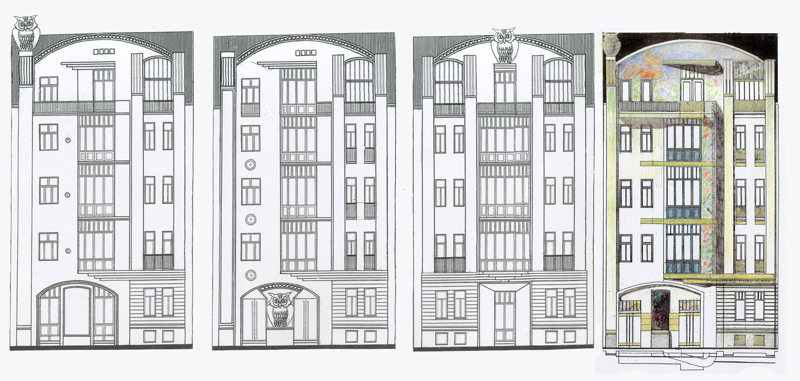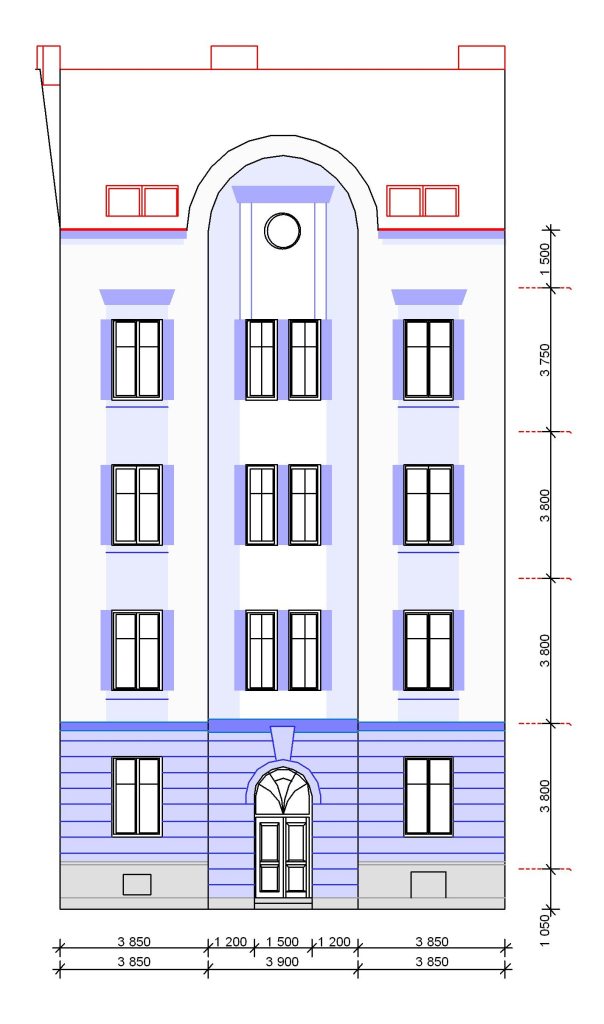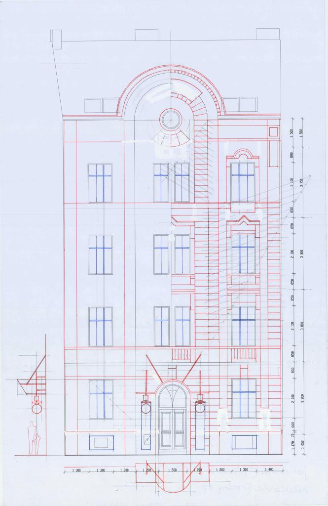 Vytvoření nové fasády předcházela několik kroků předprojektové a projektové přípravy. Předně zaměření stavu po zateplení bez původních architektonických prvků, fotodokumentace původního stavu a pak můj koncept obnovy, rozpracovaný dále do definic míry plasticity i barevného řešení.