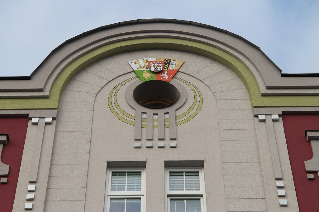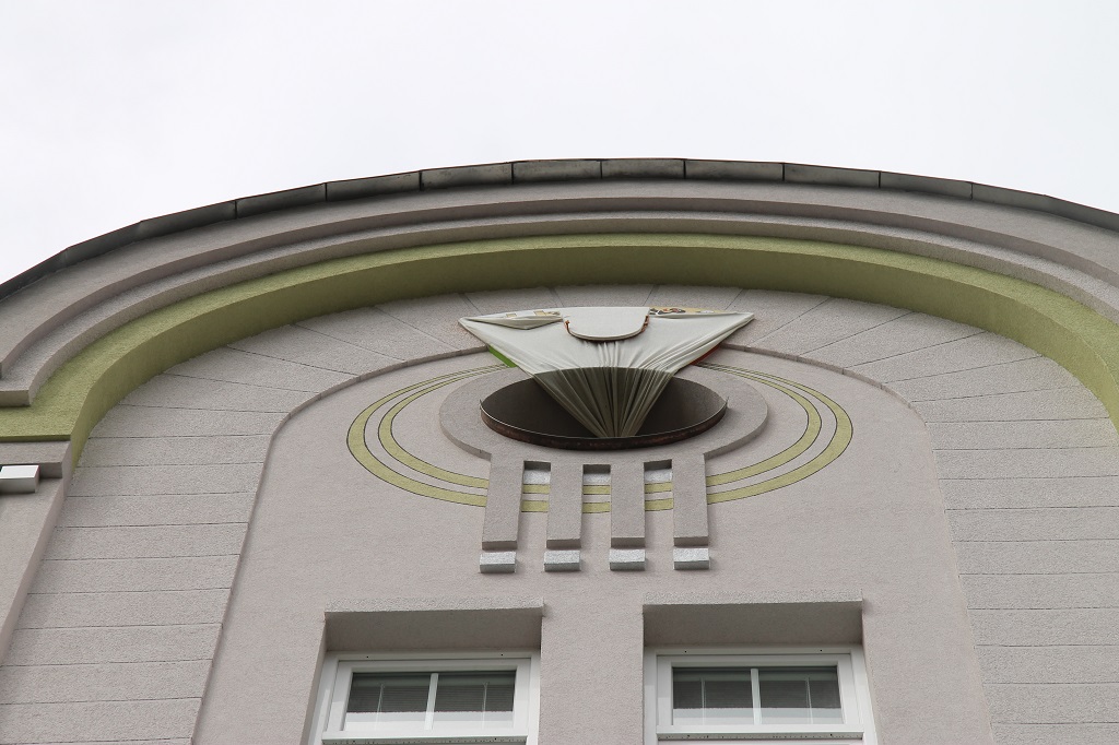 S dokončením parteru byla zároveň instalována suprafenestra ve štítě domu, zhodnocená o variace na heraldické plzeňské motivy. Optické předpoklady i zkoušky na papírové maketě potvrdily její rozlišitelnost i v dálkových pohledech v kontextu s unikátním ostrovním nádražím i frontou ostatních ambiciozních městských domů Hálkovy ulice.