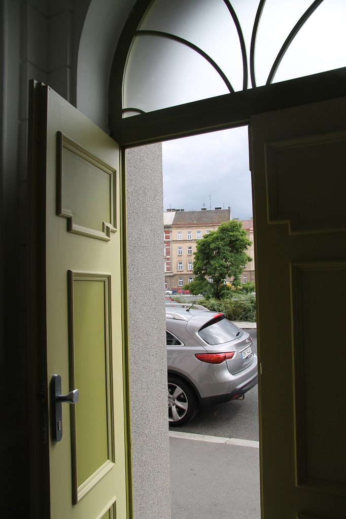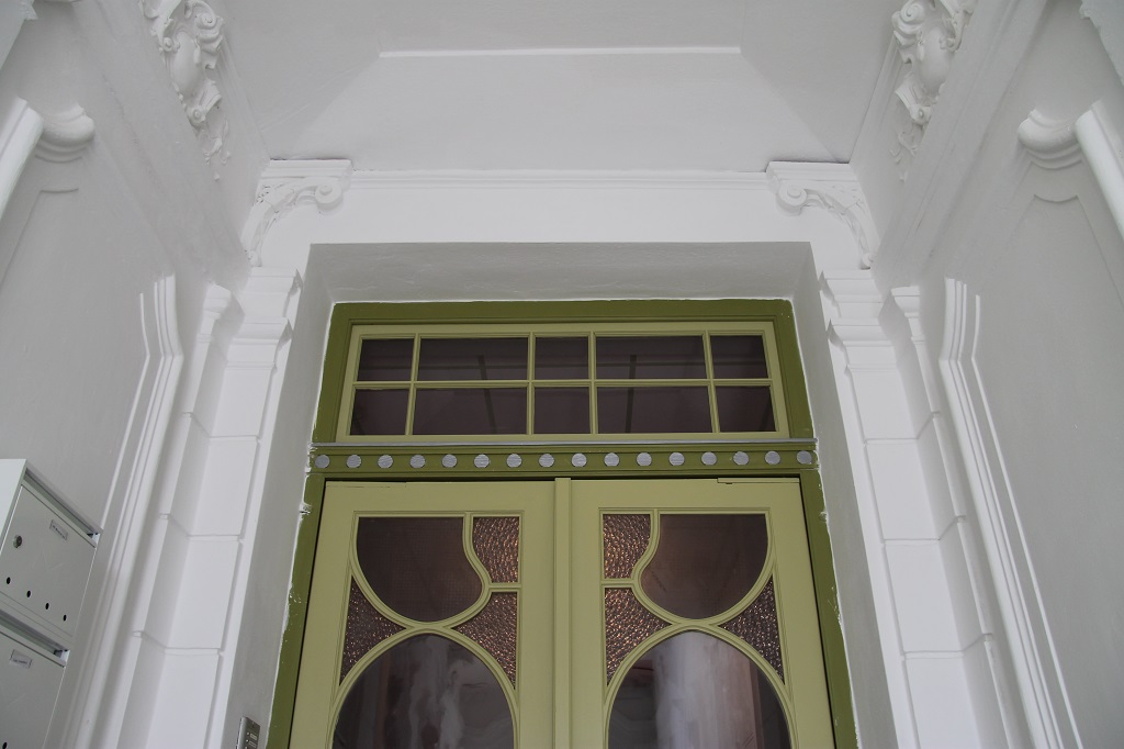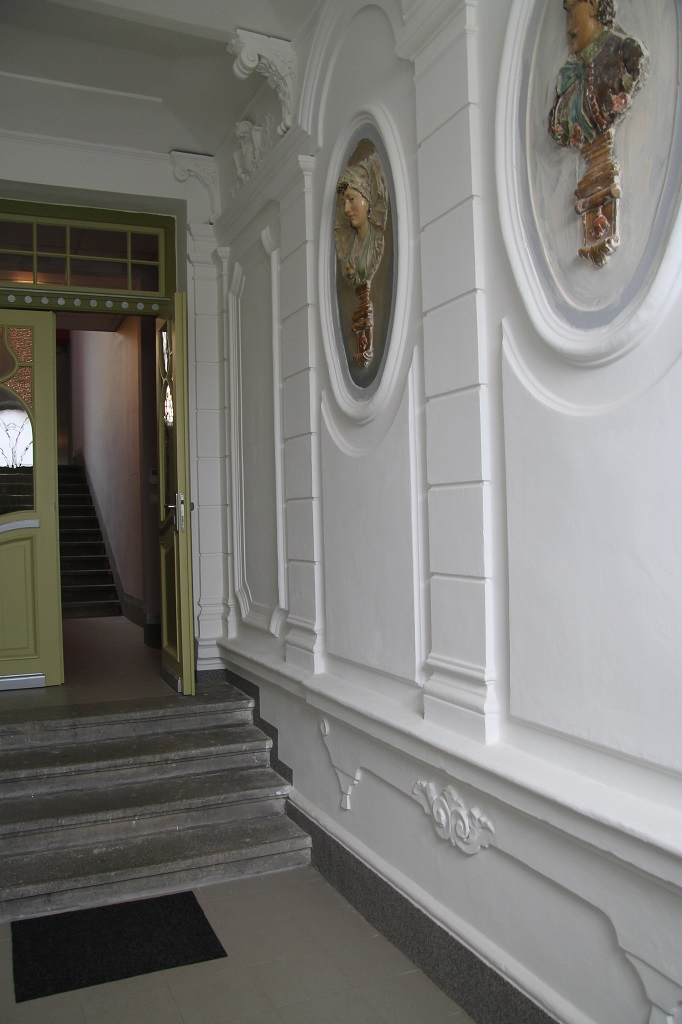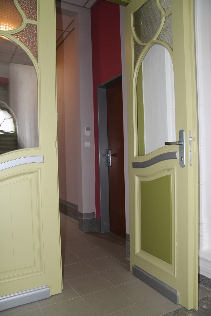Křídla dveřního portálu, zdaleka nikoliv původní, byla repasována a barevně přizpůsobena řešení celé fasády . Architektonicky nejdekorativnějším prostorem domu je vstupní vestibul s krásnými sádrovými medailony haut reliefů portrétů s tématikou lidových krojů plzeňska. Pod nánosy zabílení se našly zbytky původní barevnosti, kterou však již nelze plně identifikovat a tak výmalba bude přizpůsobena celkovému barevnému konceptu domu s důrazem na očištění repassi původní barevnosti reliefů. Dvoukřídlé dveře tepelné zábrany byly repassovány a přizpůsobeny celkovému barevnému konceptu. Původní záměr ponechat tyto dveře v jejich původní funkci a bezpečnost zajistit novou mříží se bohužel neuskutečnil a mříž nebyla realizována a původní dveře byly doplněny bezpečnostními prvky