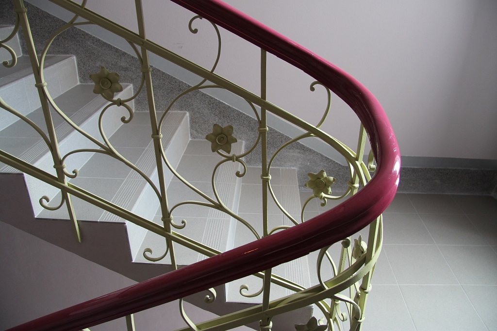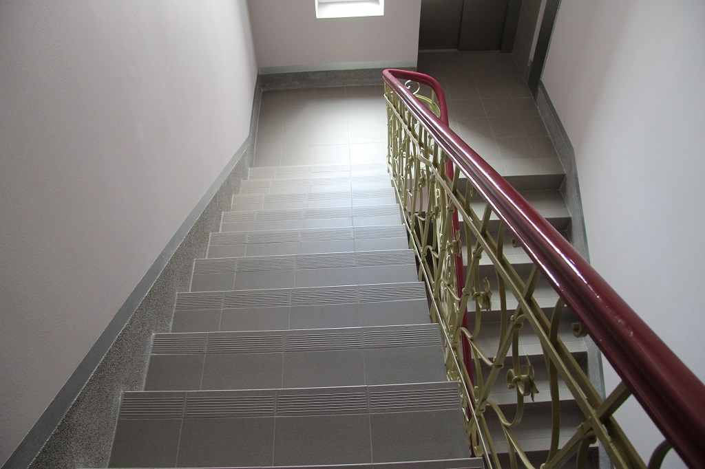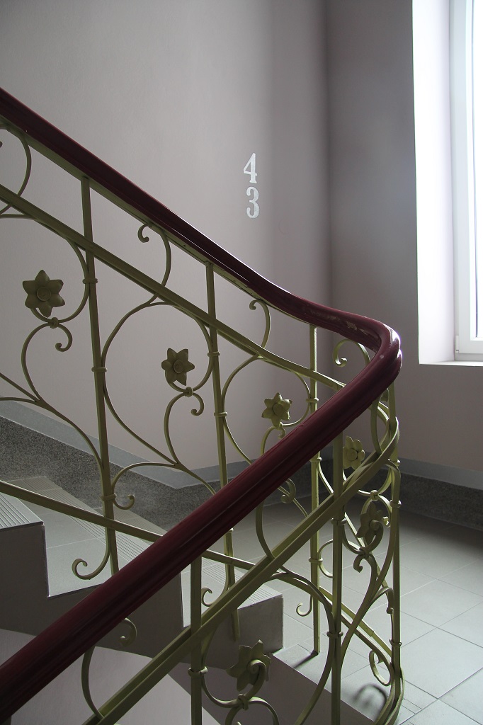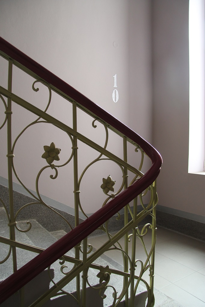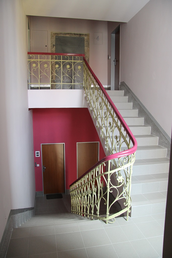 Architektonicky hodnotný prostor schodiště doznal změn, kterými jsem se jej snažil vrátit k jeho původním hodnotám a musel se vyrovnat se změnami, nad kterými se bude ještě pro definitivní řešení diskutovat. Barevnost byla odvozena z fasády, černý nátěr zábradlí, provedený v dobové kovářské práci byl nahrazen prvky celkového konceptu, stejně tak všechny vstupní portálové prvky do vnitřních prostor i do výtahu. Bohužel proponovaná zavěšená svítidla na podestách byla prozatím nahrazena provizorními stropnicemi, které nereflektují konkávní tvar vpadlých zrcadel a působí tak v celkovém konceptu nepatřičně. Majoritně byly ošetřeny žulové stupně, sokl byl proveden v majoritu a základní barevnost fasády se propsala do stěn a stropů včetně stříbrné fasádní barvy, užité pro čísla podlaží. S navrhovanými změnami dispozice se proměnila i situace na podestách, vstup výtahové šachty obohatil mezipodestu mezi podlažími. .