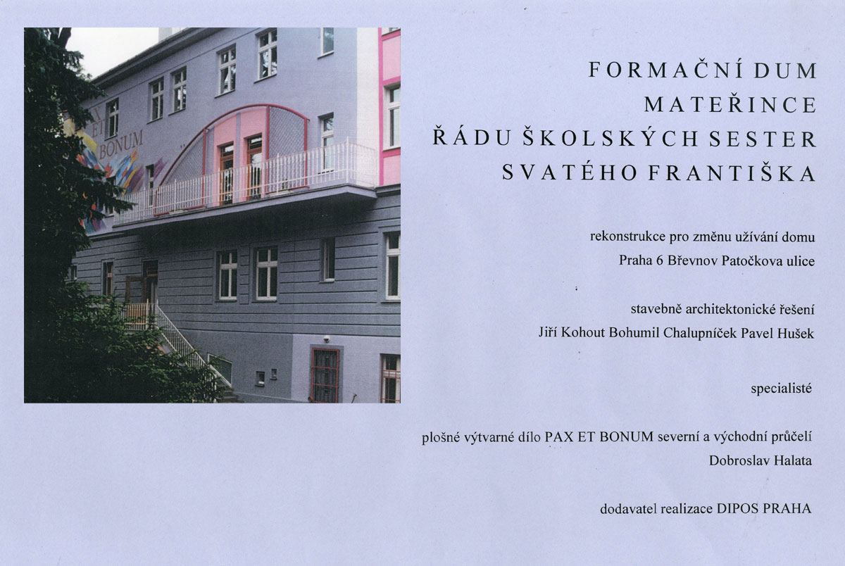 restituovaná budova byla vrácena řádu v konci devadesátých let ve stavu, který možné využití zamýšleného, tak zvaného formačního domu vylučoval. Byl zpracován projekt jeho úpravy pro tyto účely, který se projevil jednak v jeho repasi, jednak ve změnách dispozice na klášterní cely. BCH byl požádán o nové řešení fasád. S nimi spojil i návrhy prvků zámečnické práce v podobě konstrukcí pro popínavé růže, zábradlí odpovídajícímu danému řešení nebo truhlářské a sklenářské práce hlavního vchodu s novou doprovodnou parterovou architekturou. BCH zachoval základní architektonický koncept bossy přízemí a hladké fasády vyšších podlaží. Respektoval tektonická omítková členění, která doplnil volnějšími prvky geometrických křivek s aplikací církví užívaných barev. Heslo řádu PAX ET BONUM je mottem v barevné kompozici malby na nároží fasád, autorem je ak.mal. Dobroslav Halata. Autorem návrhu vnitřních dispozičních změn je stavitel Jiří Kohout. Určitá extravagance řešení vnějšího výrazu domu získala nečekané a hluboké sympatie představitelek řádu včetně aplikace abstraktní volné, barevně exponované malby. Snad i právě proto, že tento ženský řád vysílá své misie do dalekých, exotických zemí, s kulturním odkazem pro nás stále objevitelským. Konečný výzor domu byl dokonce až doposud ušetřen od projevů grafitti, kteří svoji působnost intenzivně uplatnili v širokém okolí.