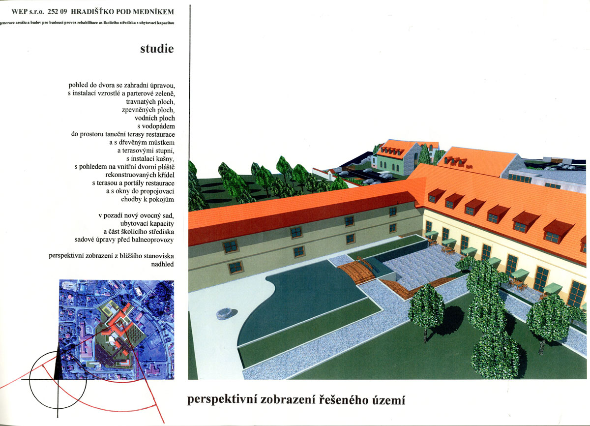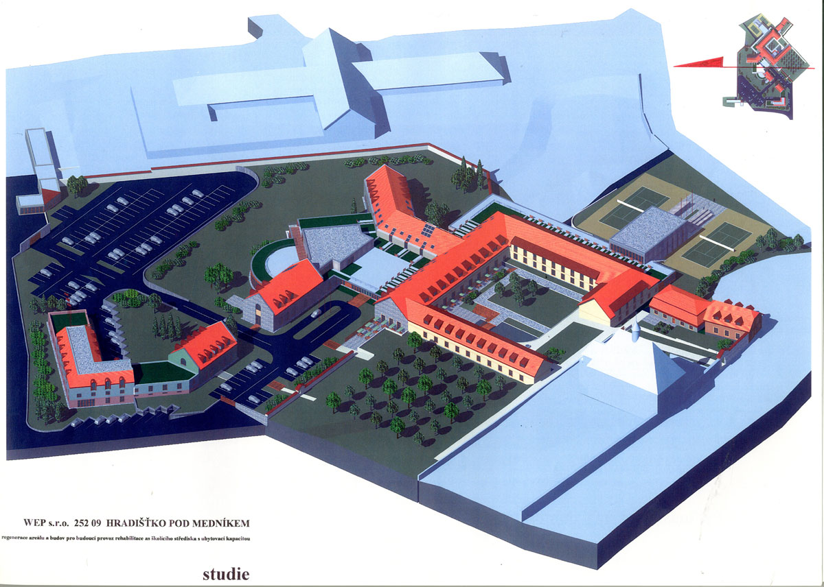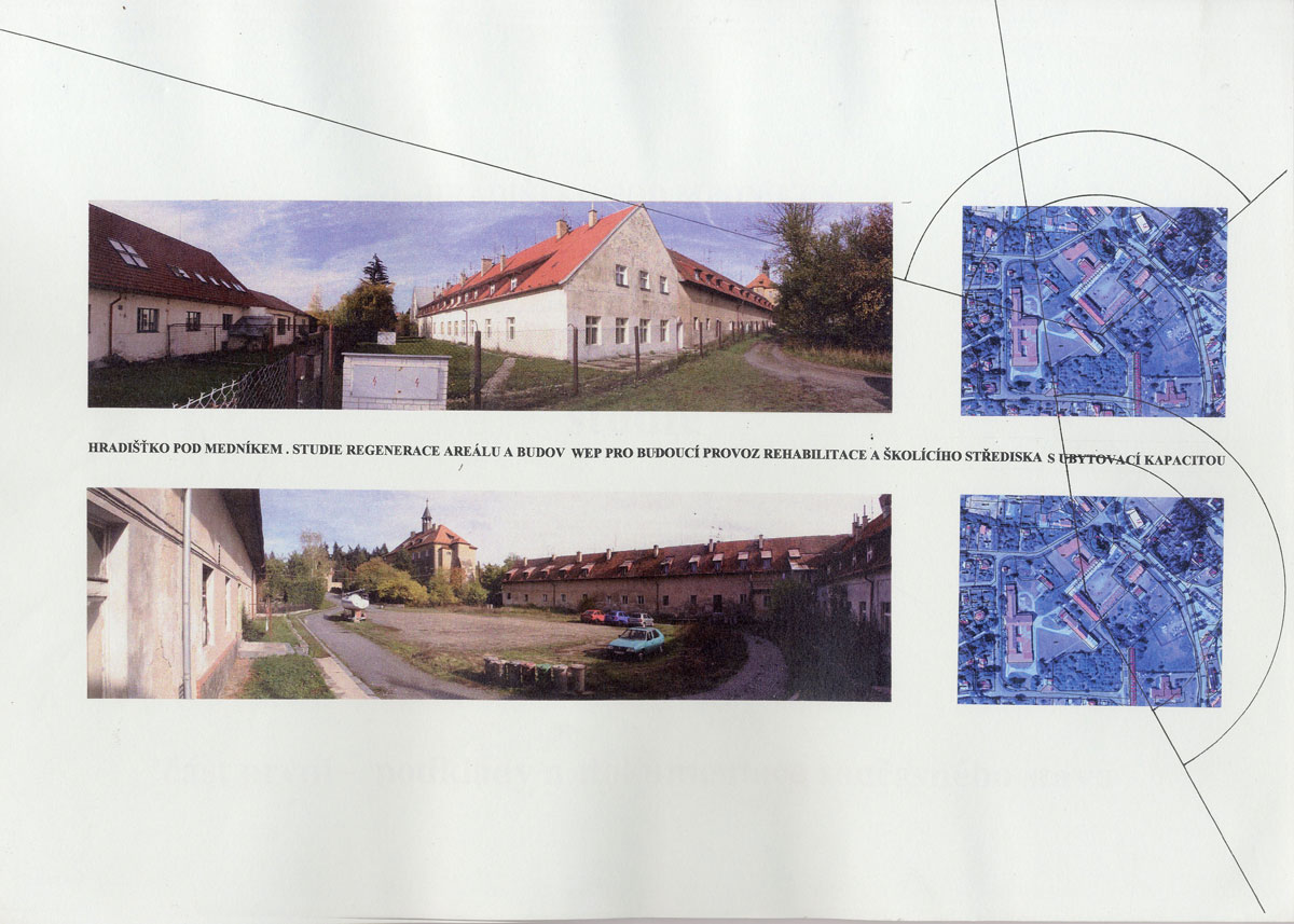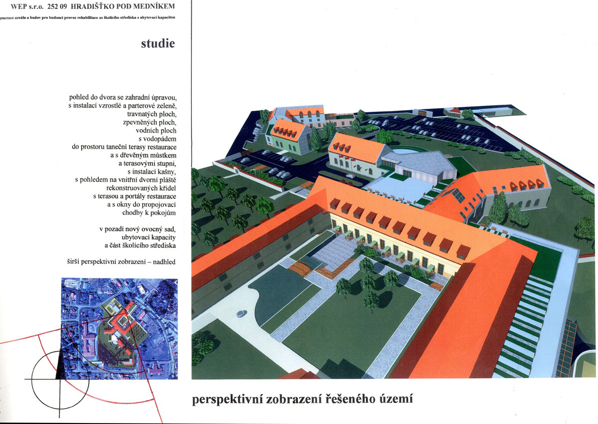 areál bývalých kasáren československé armády předválečného období, zařízení SS výcvikového prostoru v období protektorátu, "zámeček" – jakýsi domov přestárlých bratří praemonstrátského řádu. Nový majitel prosazoval ideu polyfunkčního zařízení, balneologického, hotelového, školícího, sociálního a kulturního a to se zachováním provozu tiskárny speciálních tiskovin, který by byl od nově vzniklého areálu prostorově separován. BCH byl vyzván k účasti v konkurzu projektů, ve kterém zvítězil a s ohledem na tuto skutečnost na základě objednávky pokračoval ve zpracování rozšířené studie, kterou již s úspěchem projednal s řadou orgánů státní správy. Začalo i zpracování projektu pro územní rozhodnutí. Nejasné majetkoprávní poměry k pozemkům bohužel slibně začatý program s jasným konceptem zastavily včetně potřebné změny územního plánu. Vznik jedinečného programu v blízkosti Prahy je prozatím pozastaven. Naděje na vznik řady stálých pracovních míst i smluvních podnikatelských aktivit samostatných subjektů prozatím skončila, potenciál v podobě atraktivního přírodního okolí s jeho ohleduplným zhodnocením prozatím ustupuje do pozadí. Alternativní náplň rozsáhlého areálu není doposud stanovena.