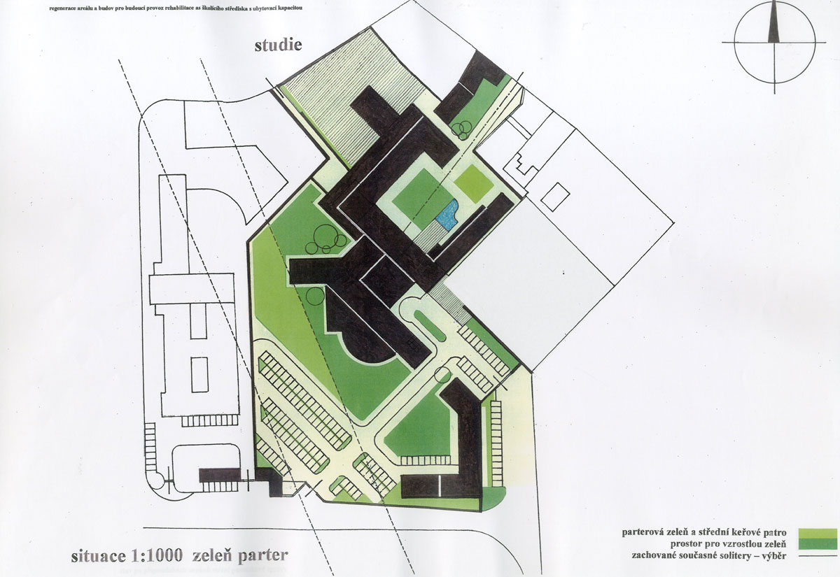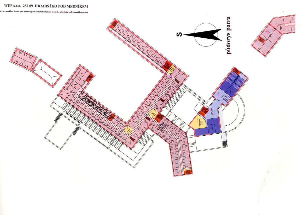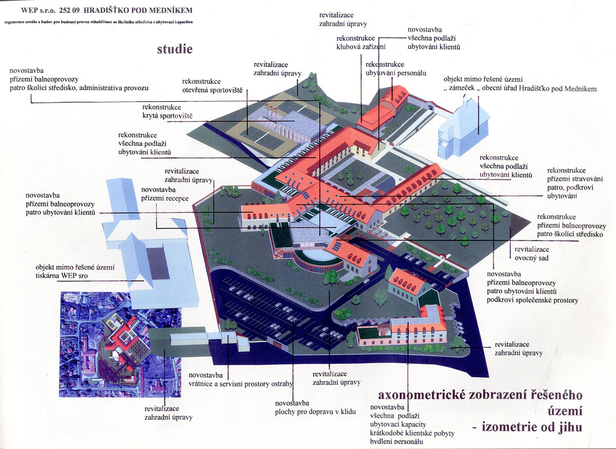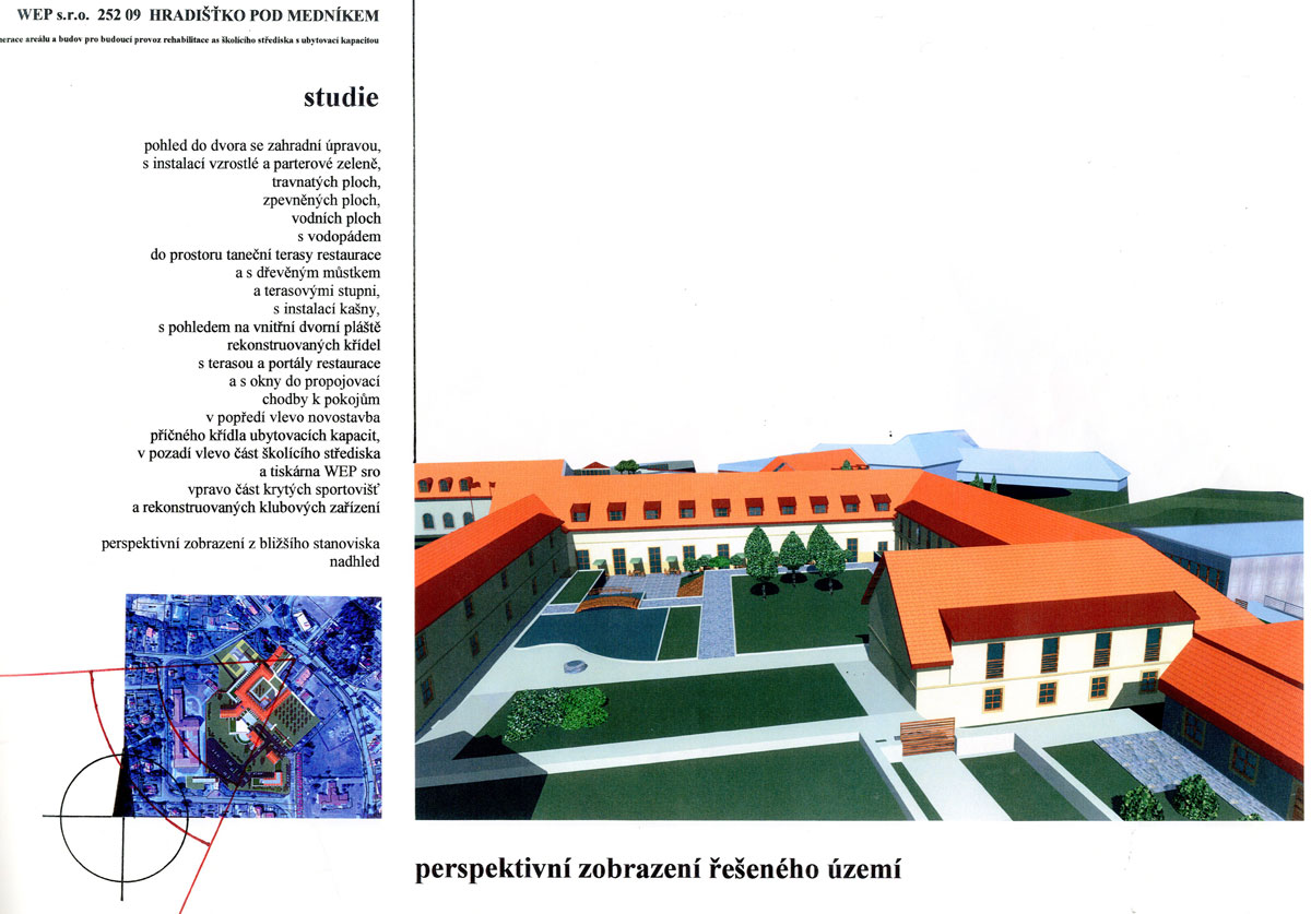 areál bývalých kasáren československé armády předválečného období, zařízení SS výcvikového prostoru v období protektorátu, "zámeček" – jakýsi domov přestárlých bratří praemonstrátského řádu. Nový majitel prosazoval ideu polyfunkčního zařízení, balneologického, hotelového, školícího, sociálního a kulturního a to se zachováním provozu tiskárny speciálních tiskovin, který by byl od nově vzniklého areálu prostorově separován. BCH byl vyzván k účasti v konkurzu projektů, ve kterém zvítězil a s ohledem na tuto skutečnost na základě objednávky pokračoval ve zpracování rozšířené studie, kterou již s úspěchem projednal s řadou orgánů státní správy. Začalo i zpracování projektu pro územní rozhodnutí. Nejasné majetkoprávní poměry k pozemkům bohužel slibně začatý program s jasným konceptem zastavily včetně potřebné změny územního plánu. Vznik jedinečného programu v blízkosti Prahy je prozatím pozastaven. Naděje na vznik řady stálých pracovních míst i smluvních podnikatelských aktivit samostatných subjektů prozatím skončila, potenciál v podobě atraktivního přírodního okolí s jeho ohleduplným zhodnocením prozatím ustupuje do pozadí. Alternativní náplň rozsáhlého areálu není doposud stanovena.