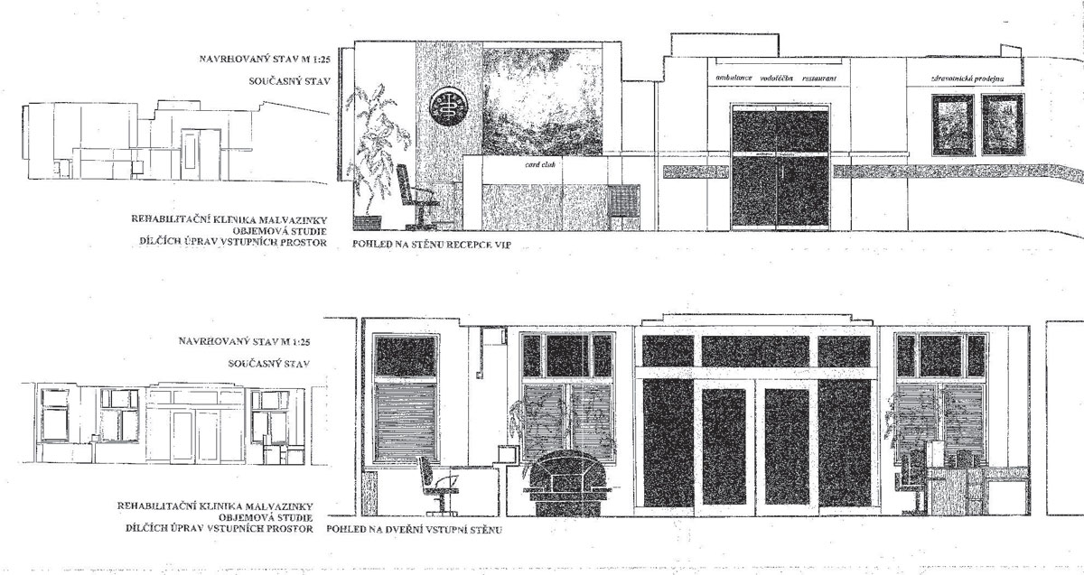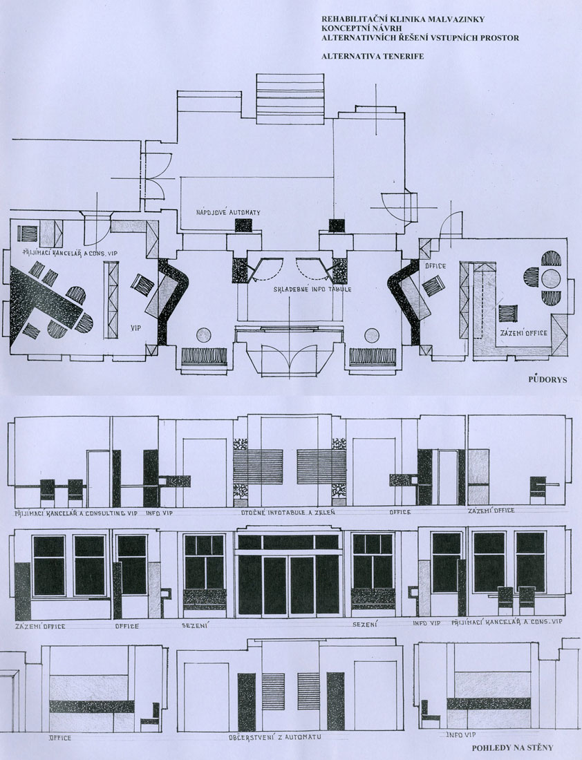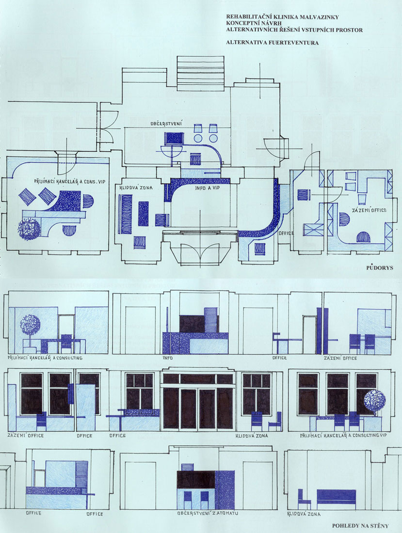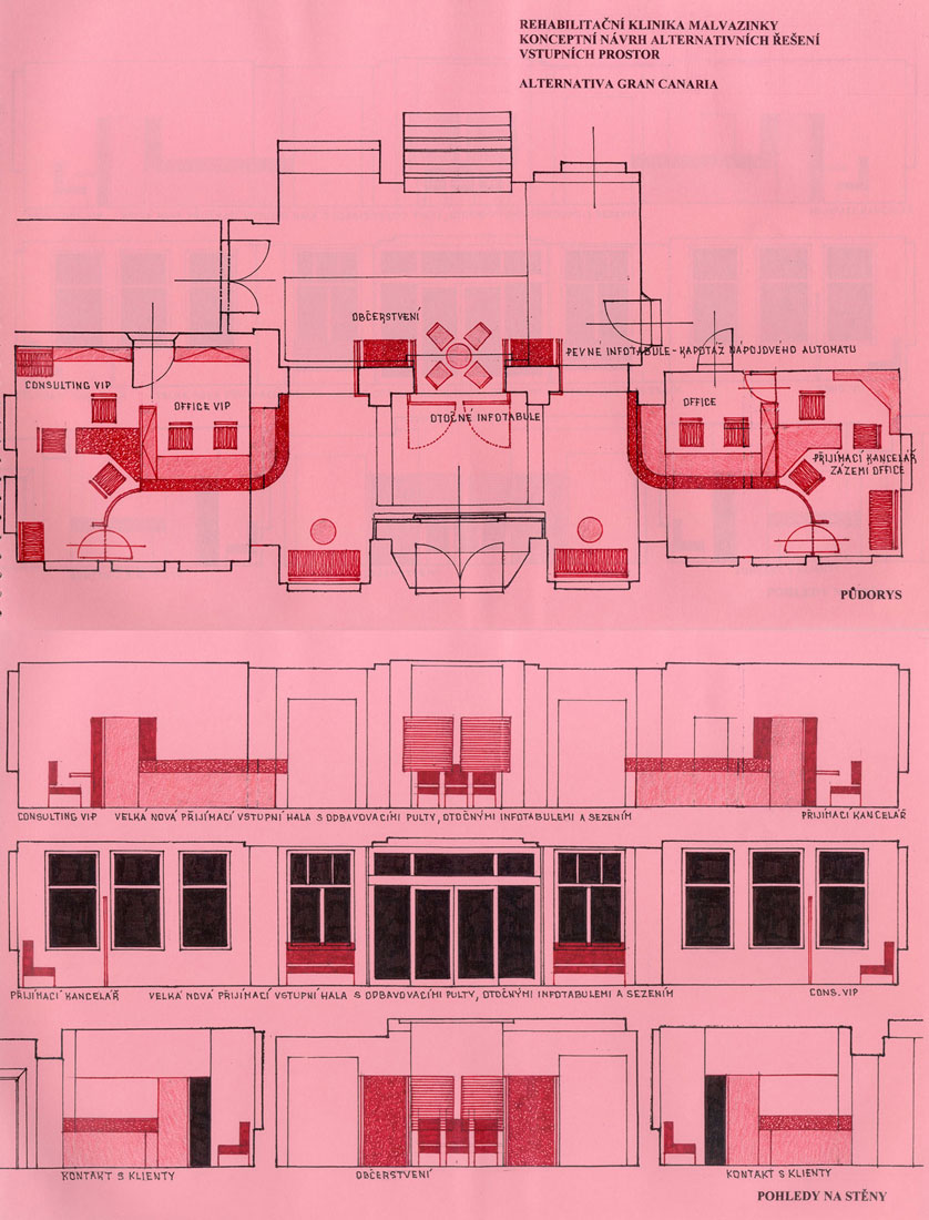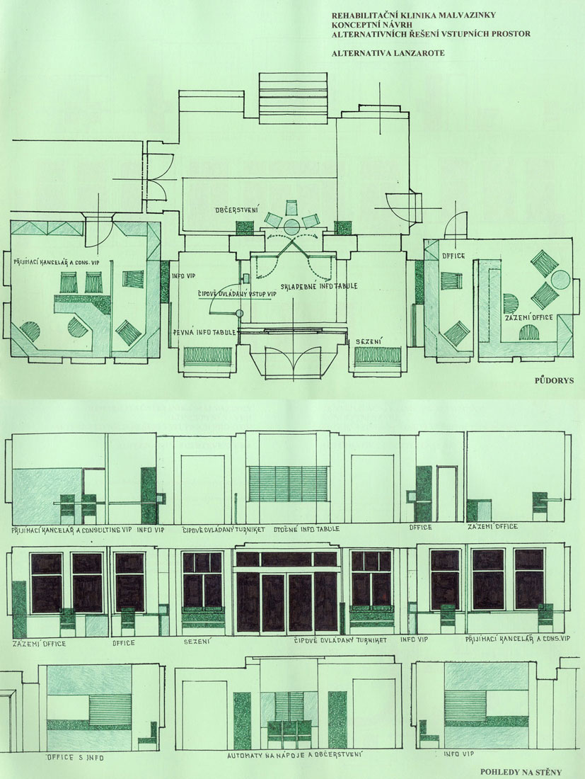 Bývalý areál Státního sanatoria v Praze byl privatizován na nestátní balneologické zařízení s širokou nabídkou. Byl realizován program přeměny areálu pro tyto specifické potřeby. Technická správa objektu, zastoupená Rudolfem Šimkem se obrátila na BCH ve věci projektu a dodávky úpravy vstupního prostoru, novou recepci a řešení vizuální komunikace jako konceptu pro celý areál. Termínová náročnost byla příčinou, že variantní studie byly zpracovány na barovém pultu hotelu Tofio na Fuerteventuře, jednom z Kanárrských ostrovů. Projekt recepce, který byl na základě výběru z daných variant rozpracován do výrobních výkresů, byl realizován.