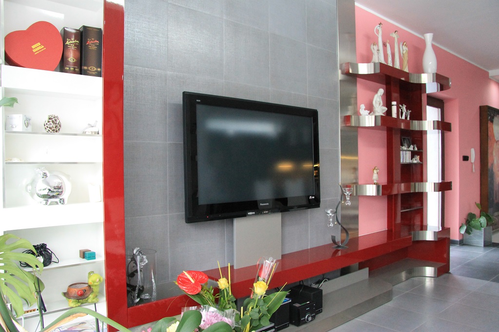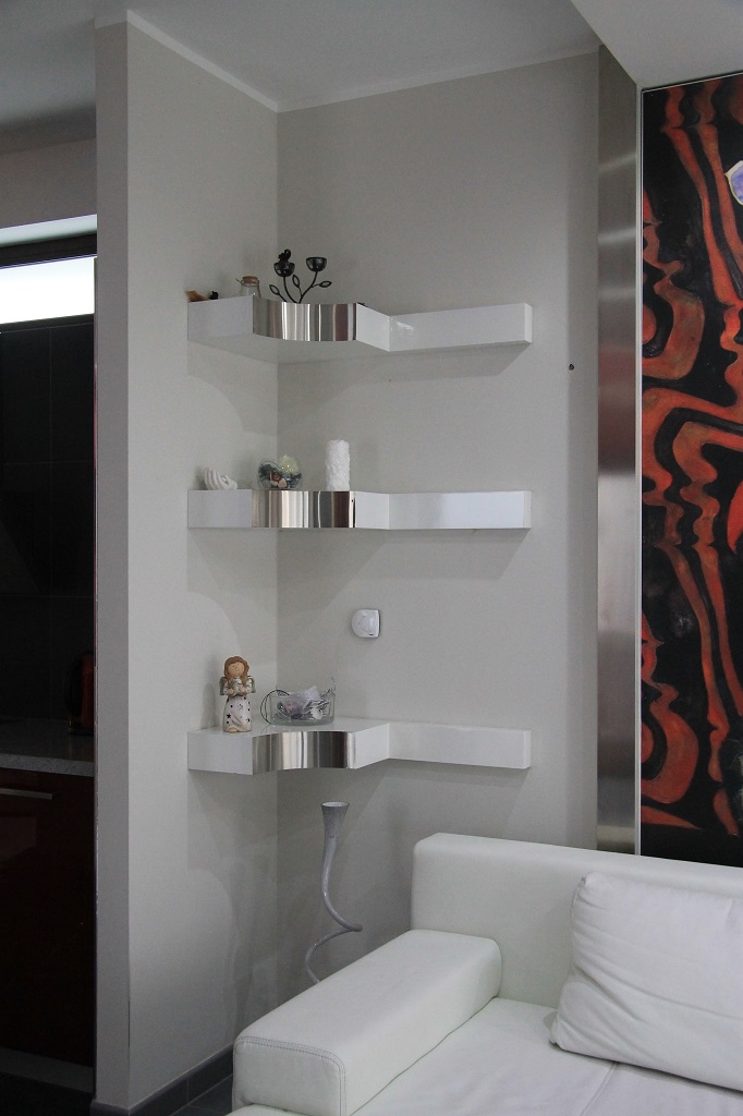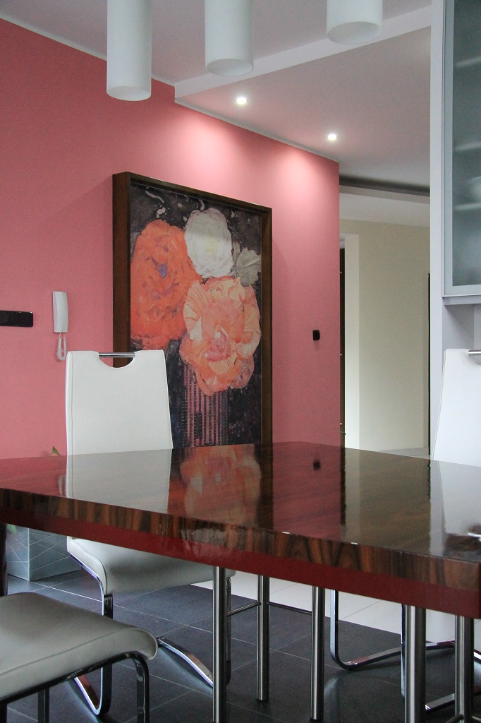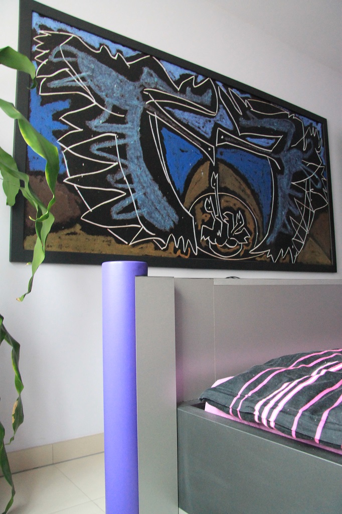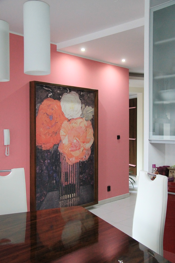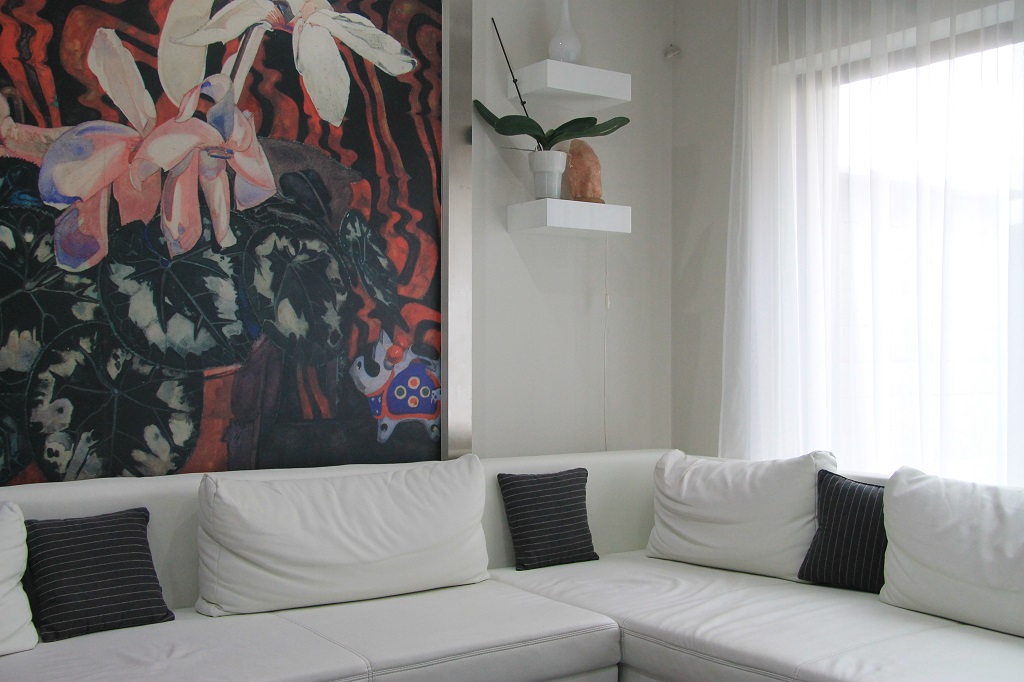 Jako dominující jsou 2 velkoplošné aplikace tiskových reprodukcí textilních návrhů z dílny Mackintosh z přelomu 19. a 20. století. Vlastní nábytkový relax v bílé barvě je typový a prostorově velmi vhodný.