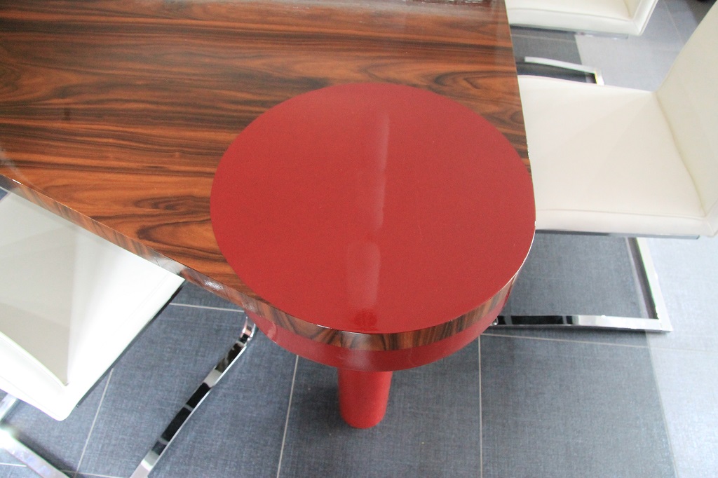 Pojítkem mezi nimi je barevný akcent tmavého kraplaku, uplatněného majoritně na kuchyňské lince, v indexu na autorském jídelním stole s tropickou dýhou – pomyslném centru celé dispozice i v audiovizuální stěně, jejíž součástí jsou i shodné keramické obklady s prostorem kuchyně. Tato šarže výrobků v různých variantách doprovází všechny prostory domu.