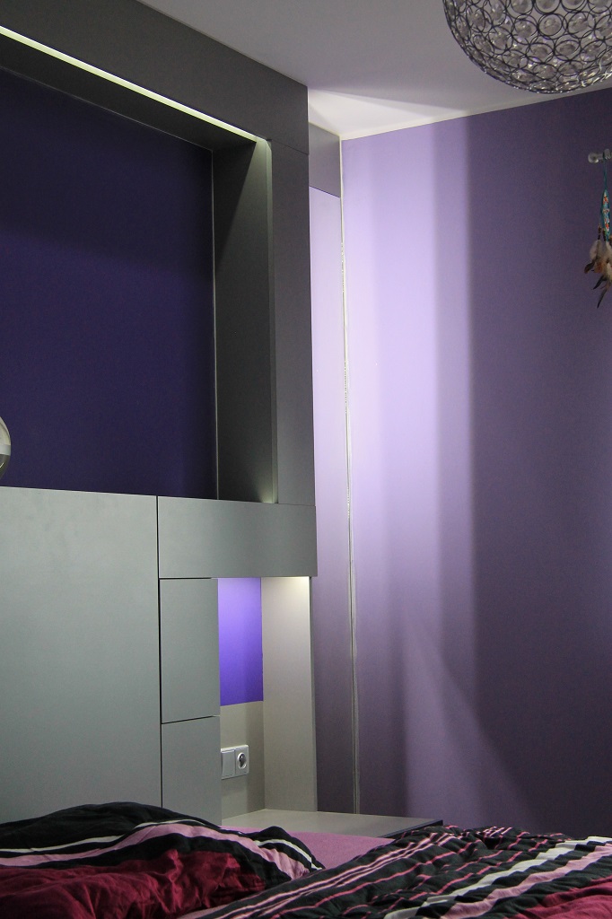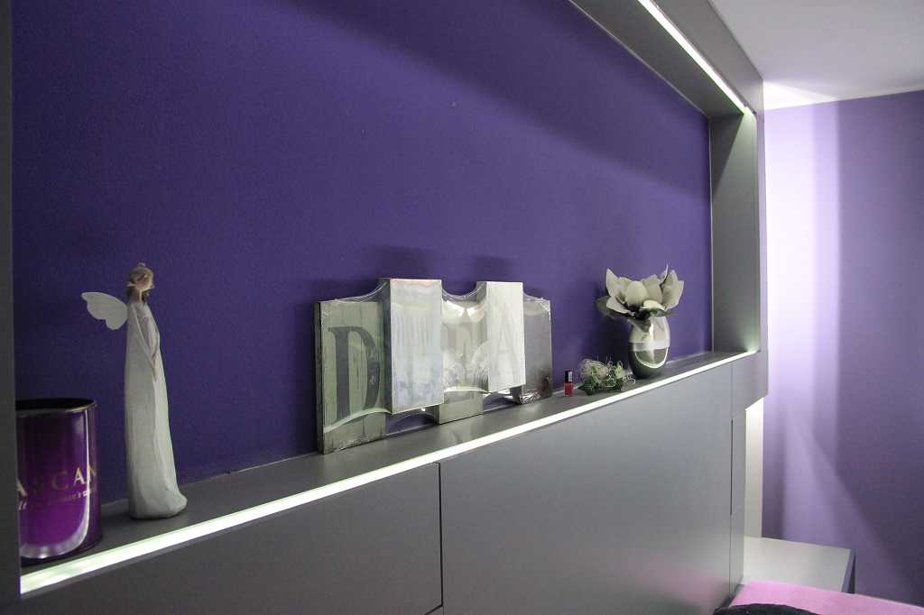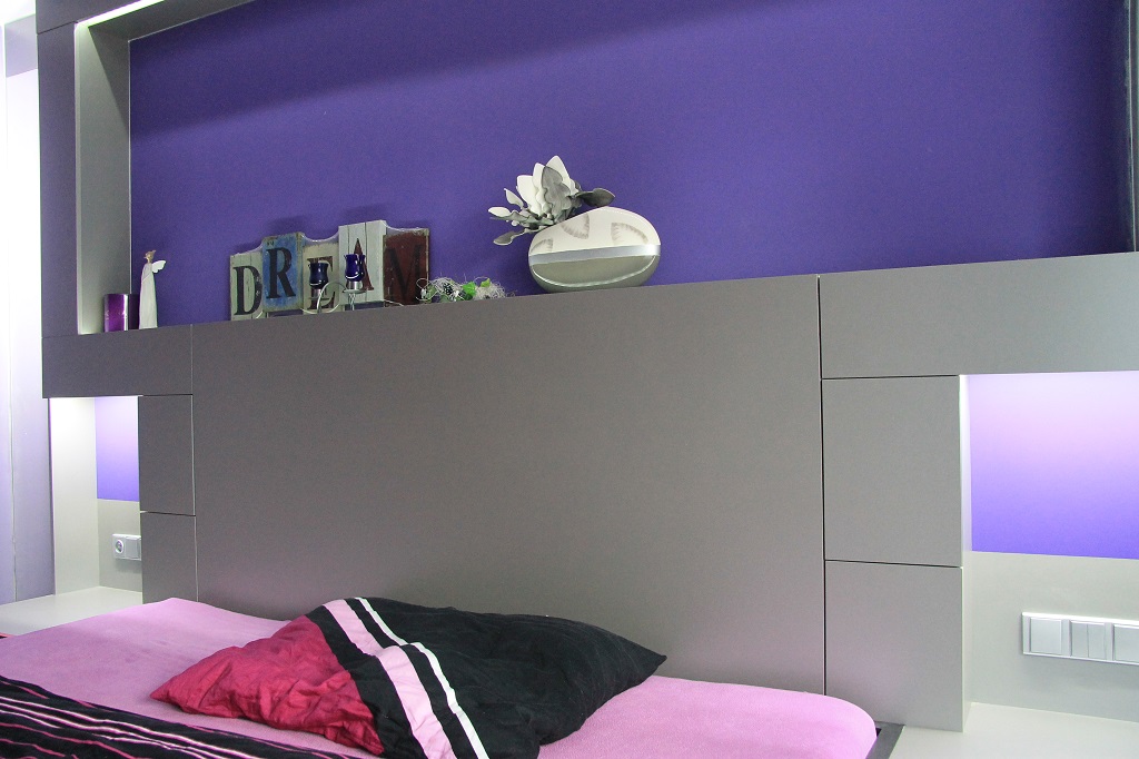 Naprostou dominantou ložnice je postel ve středu místnosti, se světelnými akcenty v různých kombinacích. Její titanový povrch dává vyniknout ostrým barevným indexům na hranách nebo jiných detailech konstrukce. Zbytkové stěny u hlavy postele jsou zrcadelné a tak celou těžkou vestavěnou nábytkovou sestavu umisťují pomyslně do volného prostoru. V parterové výšce nad hranou pelesti na protější stěně je instalováno reprodukované dílo akademické malířky Ludmily Jandové. Tehdy slečna klientka si jej vybrala jako symboliku vzniku „rodinného hnízda“ a se souhlasem zástupce rodiny bylo takto aplikováno. Jemu je přizpůsobena i celková barevnost prostoru.