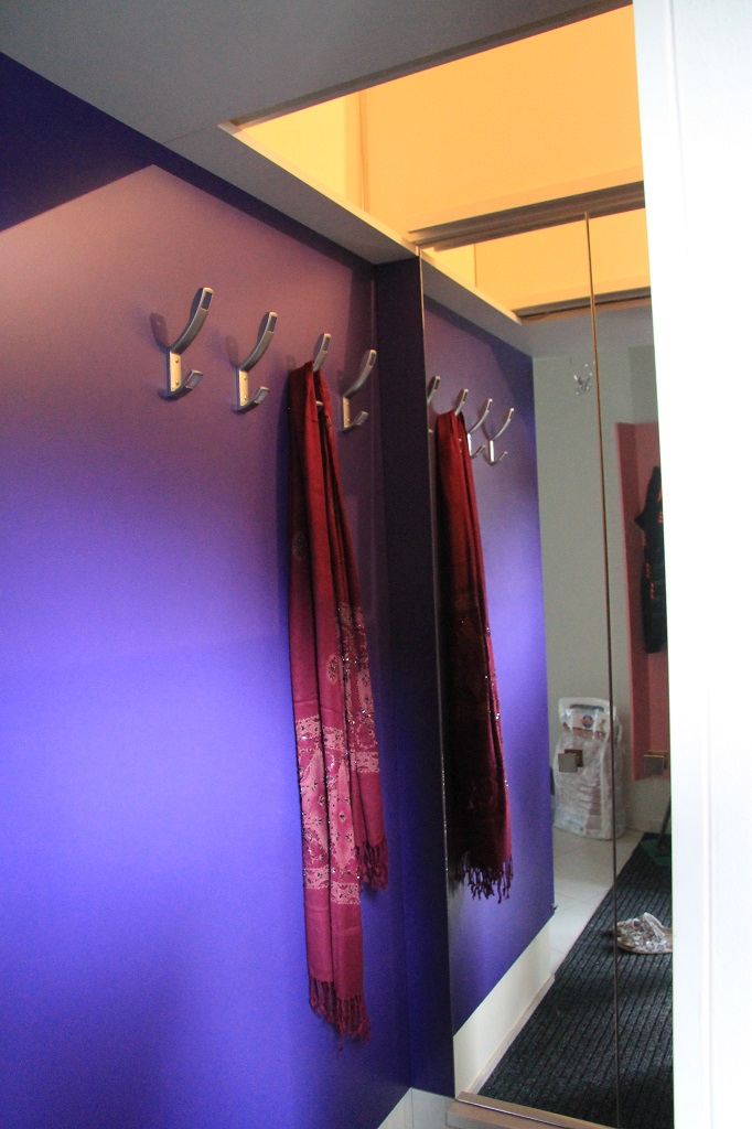 Technická místnost a zázemí provozu domácnosti je mnou řešeno jako polootevřené do vstupní haly tak, aby úvodní vjem dispozice nepůsobil stísněností a monochromatismem. Osobnost klientky se promítá právě i v barevnosti, s ní úzce konzultované. Jednotlivé odstíny dostaly i určující smysl pro jednotlivé partie domu.