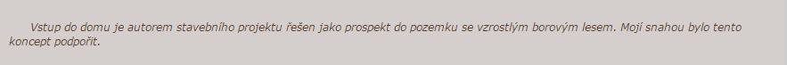 Vstup do domu je autorem stavebního projektu řešen jako prospekt do pozemku se vzrostlým borovým lesem. Mojí snahou bylo tento koncept podpořit.