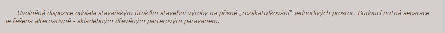 Uvolněná dispozice odolala stavařským útokům stavební výroby na přísné „rozškatulkování“ jednotlivých prostor. Budoucí nutná separace je řešena alternativně - skladebným dřevěným parterovým paravanem.