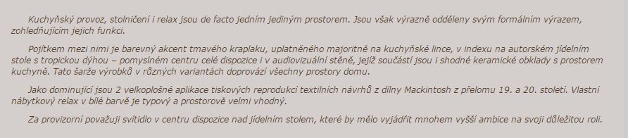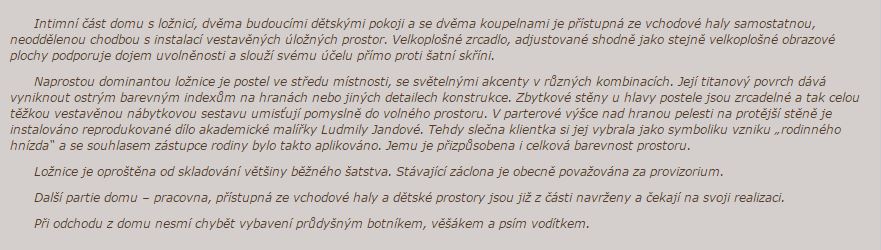 Snažil jsem se nevytvářet přeslazený, ani sladký dojem z jejího bydlení a to ani pro ni samotnou, ani pro návštěvníka domu. Interier by měl působit ve své snaze o neobvyklost možná až tvrdě v nejlepším smyslu slova, bez příkras hromaděných zbytečností. Měl by se však otevřít všem, klientce milým a drahým předmětům nejrůznějšího druhu, které by v něm nacházely své místo. Dokumentaci této realizace jsem vytvořil až po čase a stav, který jsem nalezl, mi dává naději, že jsem snad pochopil mnohé, o co ona sama i ve své nové životní roli usiluje. Proto jakýsi „úklid“ před fotografováním byl minimální a dům takto skutečně žije.