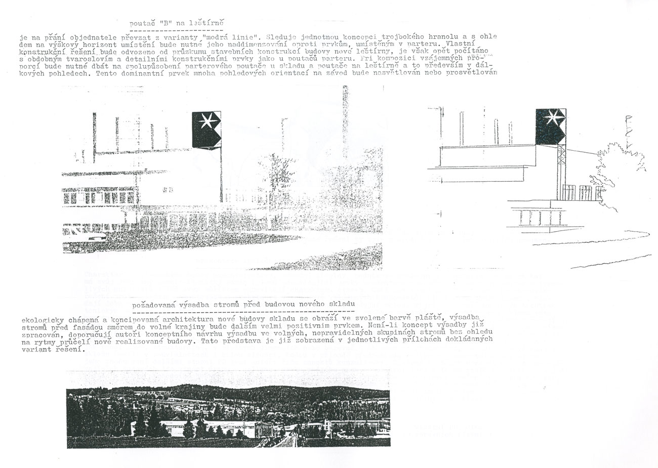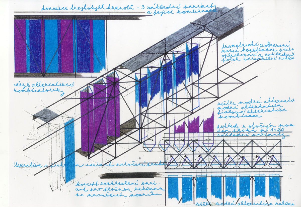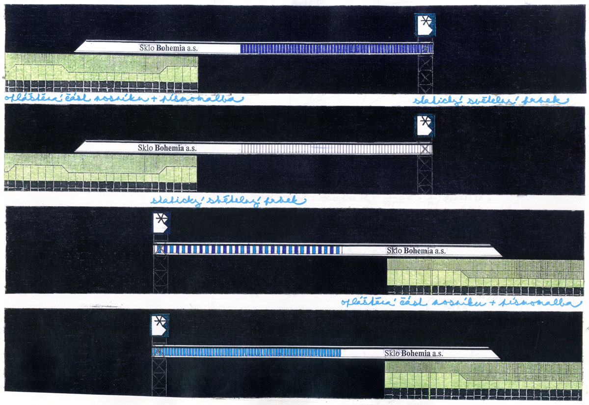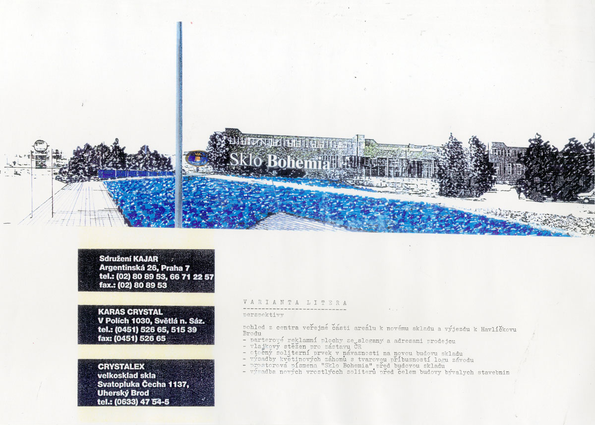 Sklárny Bohemia, těsně před svými prvními problémy, objednaly studii výrazového působení celého areálu s důrazem na své jisté a známé logo v podobě písmene B. Architektonická kancelář LANA vytvořila projekt velkoskladu výrobků, který byl realizován. BCH byl požádán o jakési "oživení" realizované stavby. Sám ji považoval za vysoce kvalitní architektonický počin, kterého by se neměl nejen z etických, ale i z legislativních důvodů dotknout. Vytvořil proto koncept vnějších, na stavbě nezávislých, cíleně scénografických prvků se silným podtextem povědomí světoznámého loga a výrazně reklamního efektu, respektujícího však charakter konceptuálně dotvořeného areálu.