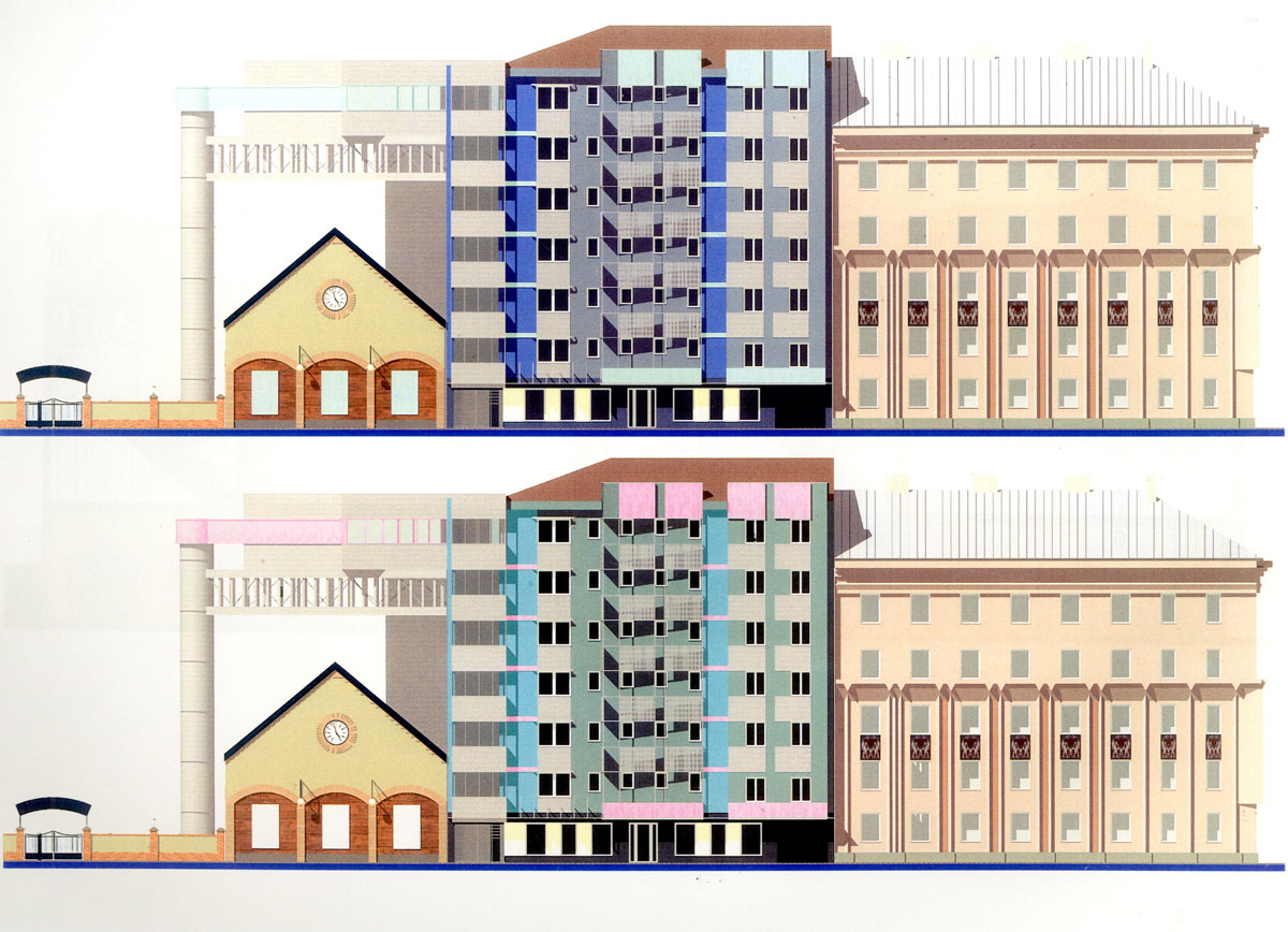 Bílá, žlutá, červená a zelená barva se jako symboly Plzně objevují v rytmické připomínce v uličním i dvorním traktu. Do řešení fasád zasáhl americký hotelový řetězec svojí westernovou grafikou, proti které nebylo s ohledem na obchodní hlediska obrany. Budiž ke cti investora, který povýšil nezanedbatelnou kapacitu hotelových pokojů dvorního traktu opravou fasád sousedících objektů.