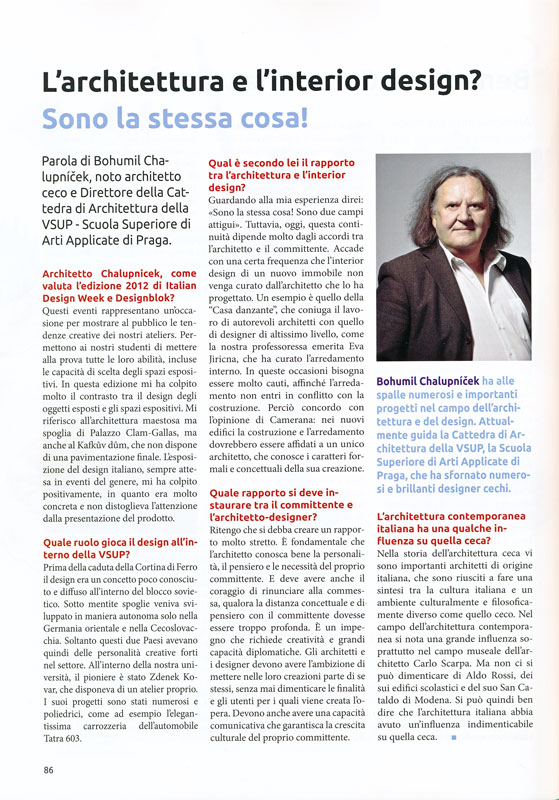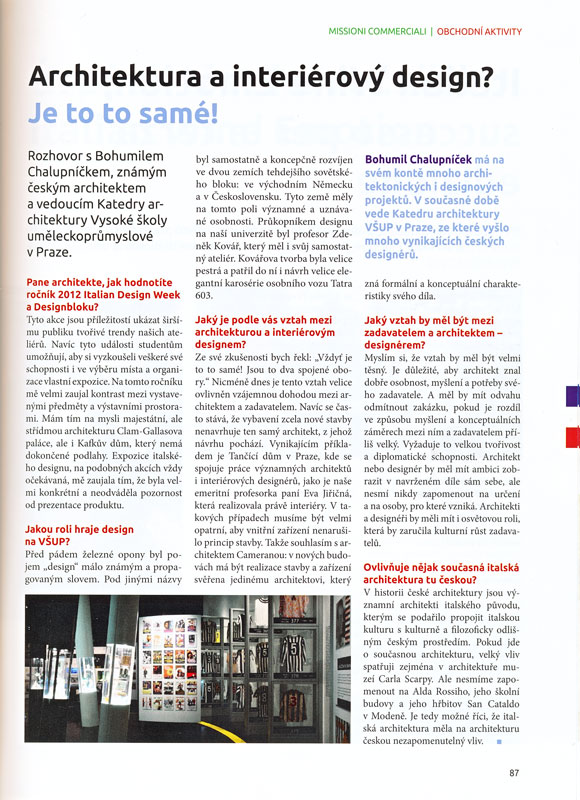 V roce 2012, v rámci akce Designblock, jsem byl Italsko – českou obchodní a průmyslovou komorou požádán o spolupráci při italské prezentaci na této dnes již velmi prestižní mezinárodní přehlídce.