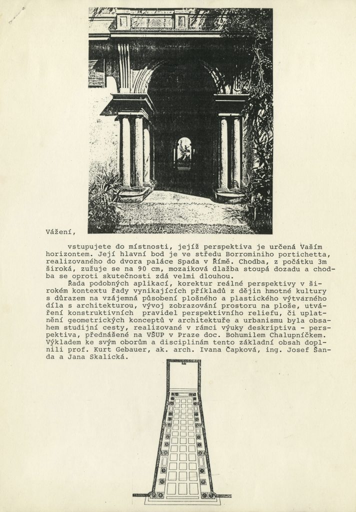 Doba mých studií od roku 1970 do roku 1976 se zvláště ve svém počátečním období dost společensky přitvrdila. Bylo však pro školu štěstím, že i tehdy v některých oborech na ní působily skutečné osobnosti. I když to byli lidé s obrovským zázemím své světově uznávané profesionality, neměli na růžích ustláno. Právě atelier architektury – v době mého nástupu na studium jediný – vedl profesor Josef Svoboda. Nechci někoho opomenout – ale i jiné obory – písmo, oděv, sklo, ilustraci, filmovou grafiku a snad ještě některé vedli vynikající umělci. Doslova trochu tajným způsobem konzultovali práci studentů i z jiných oborů a vynalézavost v tomto undergroundu byla samostatným tvůrčím počinem.