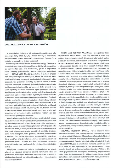 Pro vyjádření své úvahy, o kterou jsem byl požádán a kterou se snažím formulovat s nejvyšším respektem, mám velmi nelehkou, zároveň však i výhodnou, nezávislou polohu. Můj vztah k malířskému sympoziu v Nových Hradech je pro mne ve svém hlavním významu již druhým rokem týdnem osamění v příbytku.