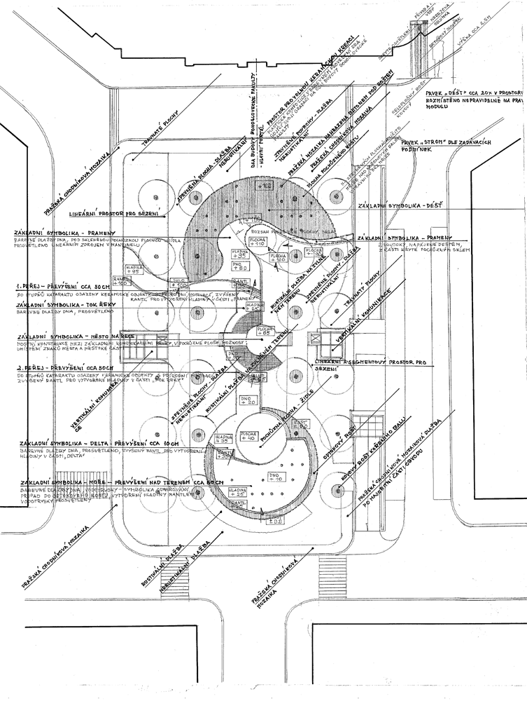 ŘEKA, varianta, která dané koryto vodoteče ponechala v základním tvaru a obohatila jej dalšími, vodou naplněnými tvary. Ideou byla cesta řeky – nedefinovaně Vltavy, protékající Prahou. Řešení využilo svažitého terenu jako symbolu i jako funkčního artefaktu. "Řeka" pramení pod kovovými rošty v horní části náměstí a jednotlivé prameny se stékají do hlavního řečiště – dané vodoteče. Překážky a přemostění toku symbolizují průtok řeky městem – bez dalších symbolik soutoků a podobných upovídaností končí řeka svojí deltou do moře – velkým bazenem ve spodní části náměstí. Architektonické tvarosloví bylo počítáno pro instalaci mnoha keramických prvků, monolitů s barevnými glazurami, vsazených řece do cesty nebo s řadou mozaik, obohacujících dno řečiště – autor návrhů profesor Václav Šerák. Především horní část řešení u pramenů nezabraňovala přímému kontaktu diváka s vodou – umožnila mu brodění nebo kontakt s padajícím, osvěžujícím vodním filmem. Varianta vzbudila velký zájem, její slabinou bylo sezonní využití - problematika "opuštěnosti" v zimních měsících. Další výtkou byla největší odchylka od původního zadaného architektonického řešení, která byla trochu nespravedlivá – odchylky byly minimální. V návrhu scházelo grafické rozlišení, které by toto tvrzení objasnilo.