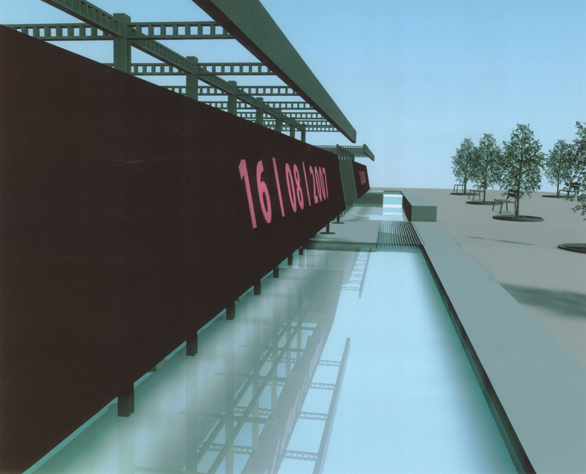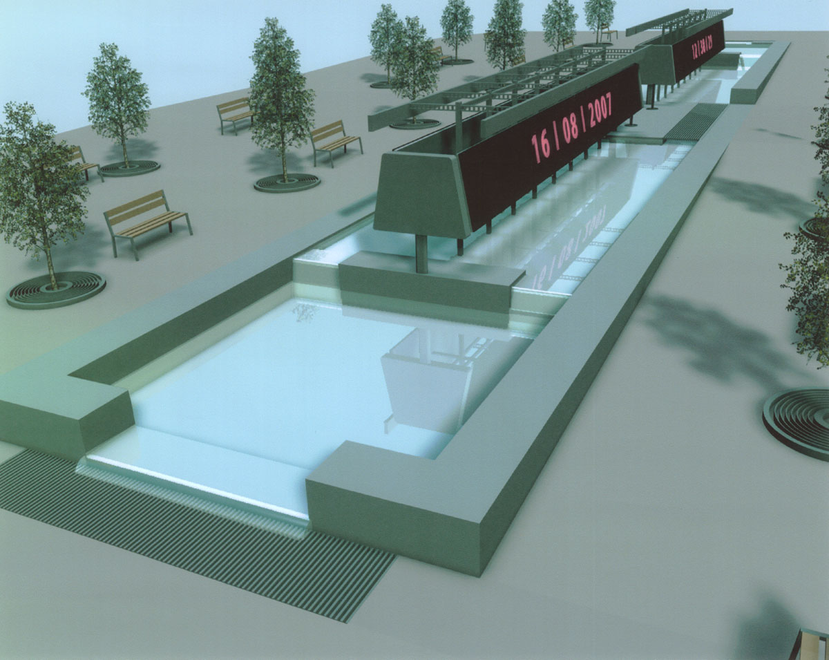 LITERA, varianta založená na lineárním displeji pro otevřené vzkazy kohokoliv komukoliv. Budou smývány vlnou, která se vyprovokuje v dané vodoteči. Tento Duškův koncept byl ze strany BCH rozpracován - jednotlivé nápisy symbolicky smývala na místo vlny vodní clona, lineárně postupující z trysek horizontálního nosiče, kontinuálně s mizejícím písmem. Pro tyto světelné tabule byl vytvořen návrh nosiče – prostorového objektu, sledujícího osově vodoteč. Jeho čela by nesla heraldické výsostné znaky městské části, linie by byla rozdělena do sekcí. Celá instalace mohla sloužit zároveň jako informatorium Prahy 6, stejně jako pro nájem jinými subjekty v omezeném rozsahus ekonomickým profitem. Počítalo se s efektem reflexe ve vodní hladině, základní myšlenkou bylo smývání písma či obrazu postupujícím proudem vody v podobě velkoplošného řízeného vodopádu. Elektronická část zařízení mohla být funkční po celý rok, v pozdních nočních hodinách mohla být plocha stabilním tlumeným osvětlením prostoru. Ve večerních hodinách by rušivé světelné jevy pro okolní bytovou zástavbu tlumila vzrostlá zeleň. Tato varianta vzbudila nejmenší ohlas.