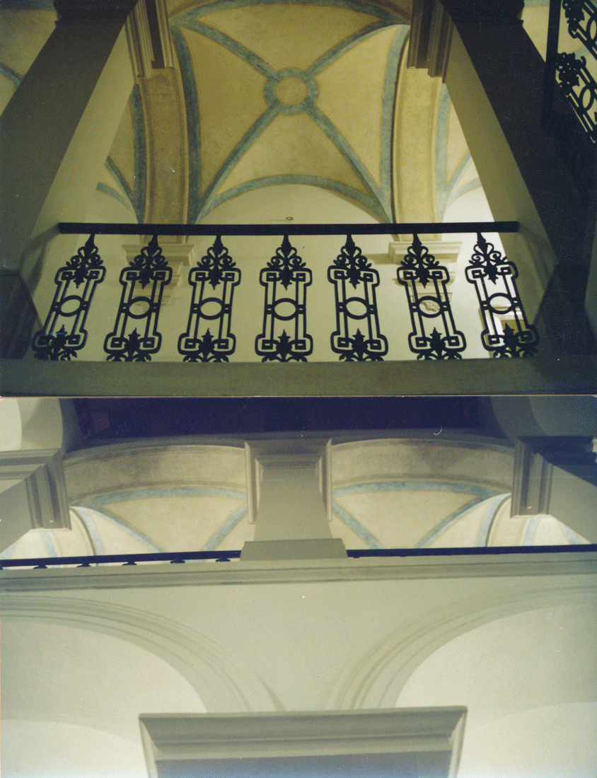 Za této situace mne rektor profesor Hlaváček požádal o řešení této situace. Byla vypsána výběrová řízení pro dodavatele a rekonstrukce se zaměřila především na společné prostory školy. Při nových výmalbách byly objeveny původní fresky, které ornamentálně reagovaly na křížové klenby chodeb. Jejich rozsah byl obrovský – v rámci celého přízemí a prvního patra, s barevným odlišením. Jejich obnova se stala předmětem emotivních diskusí. Bylo to pro mne určitým překvapením, kterého – jak věřím, bych se dnes již snad nedožil. V tehdejší době stačil jeden hlas proti, aby bylo zvikláno právo na repasi původního konceptu budovy. Bombardovaly mne telefonáty, které poukazovaly na nevhodnost obnovy takových prvků ve vztahu "jak budeme vypadat před studenty". Do této hry se pochopitelně zapojil i památkový dohled a situace byla skutečně zajímavá natolik, že z ní šlo vyjít obapolným kompromisem. Malby jsou ošetřeny a zakonzervovány pod novými vrstvami pro budoucnost. Jejich připomínkou jsou zrestaurované fragmenty v prostoru vestibulu před vrátnicí v přízemí - v kraplakové barvě a před rektorátem v prvním patře v barvě modré. Dnes působí již zcela samozřejmě, v kontextu s celým domem.